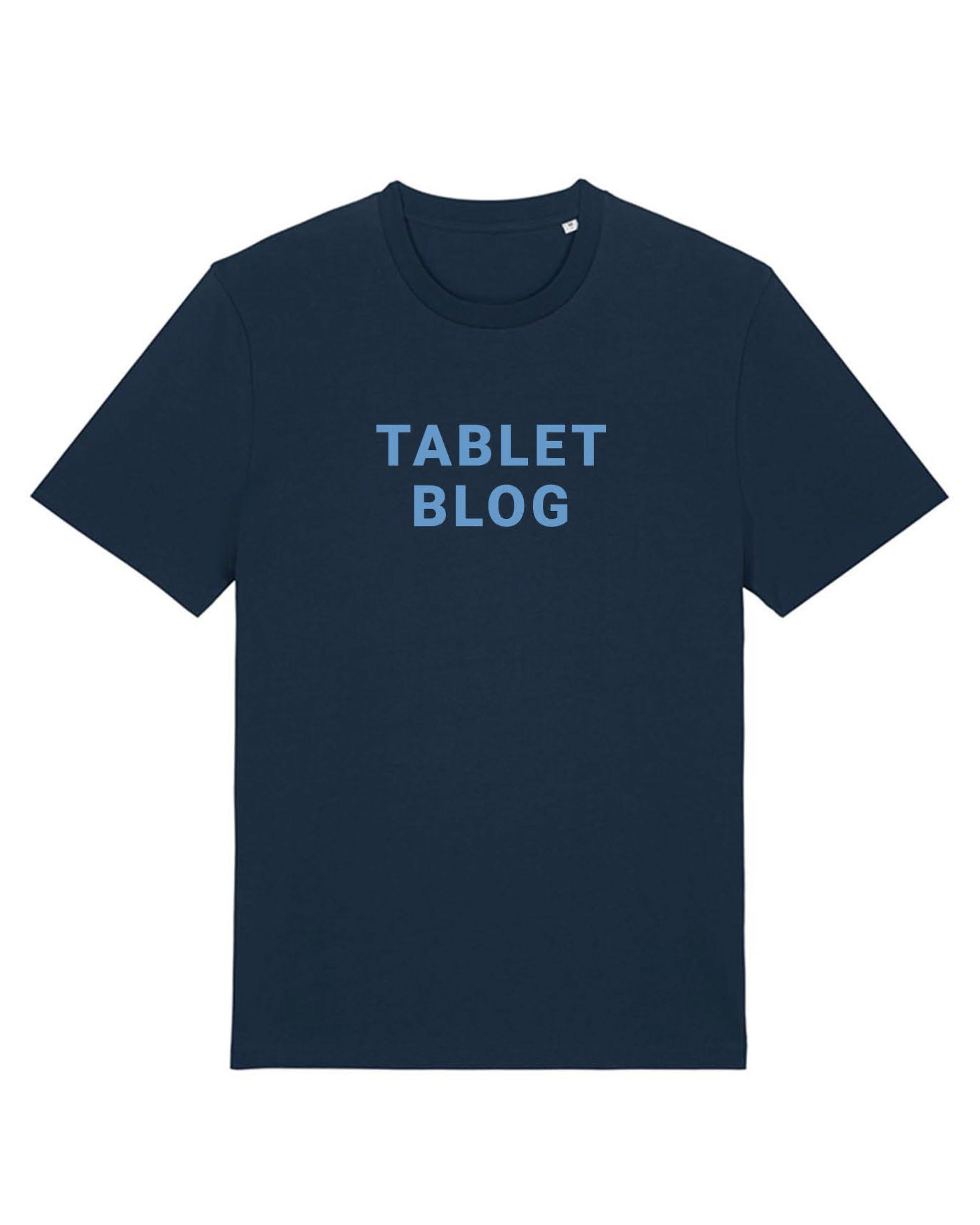 Das dunkelblaue T-Shirt wird durch das blaue TabletBlog-Logo kaum vom Basis-Ton abgehoben, sondern fügt sich perfekt ins Gesamtbild ein. Dieser subtile Ton-in-Ton-Look ist gerade total im Trend und macht dein Outfit sofort cooler, ohne zu überladen zu wirken. -